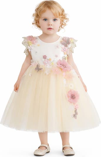 - 100% PolyesterFitted bodice with floral appliqués and lace detailingShort ruffled sleeves with lace trimWaistline accented by lace peplumFull layered tulle skirt with butterfly and flower appliquésImported