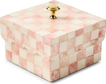 Store precious keepsakes in this elegant box made from capiz shells and styled with Rosy Checks, a scalloped edge and golden knob.