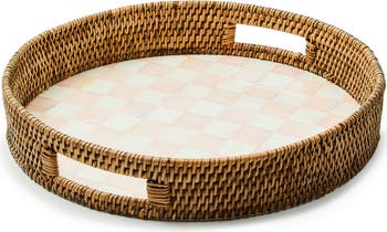 Nibbles, tea and treats are so much more appetizing when served up in the hand-painted color-dragged checks of this enameled-steel and rattan tray.