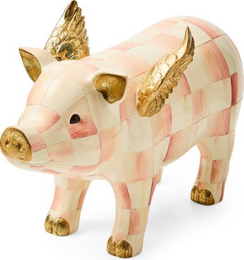 Add a whimsical touch to your home with this charming pig figurine adorned with a Rosy Check pattern and golden wings, looking ready to do the impossible and take flight.