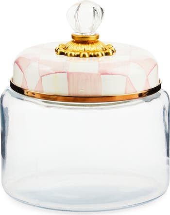 Keep countertops tidy with this glass canister sealed off with a check-painted lid.