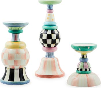 Elevate your illumination situation with the whimsical presence of these candleholders that are hand-painted with color-dragged checks that amplify your candle's flame.
