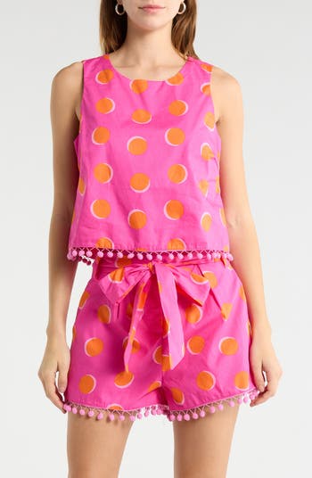 Playful poms line the hem of this breathable cotton-poplin top patterned in eye-catching polka dots.