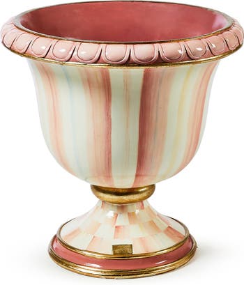 Make a dramatic statement, indoors or out, with the pink hue and gilded details of this urn made from weather-resistant materials for years of handsome good looks.