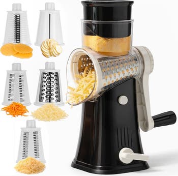 Manual rotary cheese grater with 5 interchangeable drums, non‑slip suction base, and dishwasher‑safe design for easy slicing, shredding, and chopping.