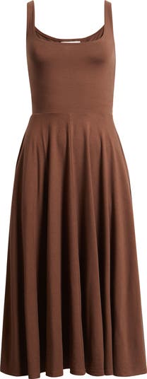This sleek midi-length dress is fitted in the bodice and fashioned with an easy-fitting flared skirt. It's made from Reformation's Eco Cinch knit—a lightweight, soft jersey made from sustainably produced Tencel™ lyocell fiber knit with spandex for shape retention.