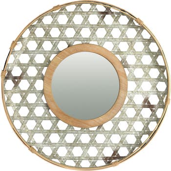 - Round 2 tone wall mirror with galvanized metal in a lattice design and wood rim; Includes keyholes for easy mounting