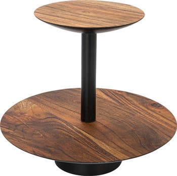 - A stylish and functional 2-tier tray with a natural acacia wood surface and a black metal stand