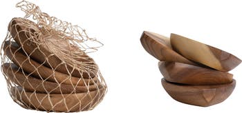 - This boho-inspired set of 4 acacia wood trays showcases organically shaped round silhouettes