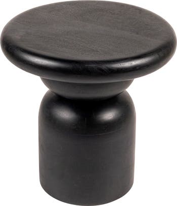 This mango wood accent table with an end grain base and black finish is a stylish and sturdy addition to any space. The mango wood construction offers a natural texture and lasting durability. The end grain base highlights the wood's unique pattern, enhancing its organic appeal. Measuring 18 inches in diameter and 18 inches in height, this versatile accent table is perfect for living rooms, bedrooms, or cozy nooks. It arrives partially assembled for easy setup. A blend of style and function, this table brings warmth and character to any space.