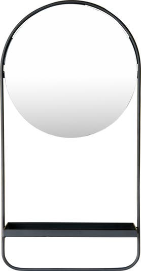 This minimalist wall mirror features a sleek metal frame and attached shelf; Made from glass and iron; Mirror measures 12" L x 4" W x 23" H