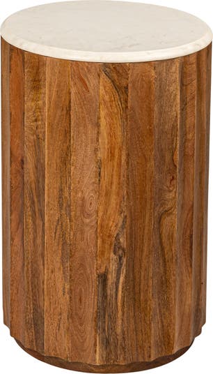 - Crafted from solid mango wood with a fluted base and marble top. Each piece will be unique due to natural variations found in marble.