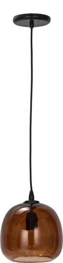 - A round and elegant glass and metal pendant lamp that has an amber color and a smooth finish that adds a warm and cozy touch