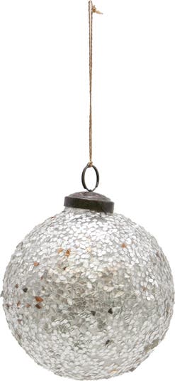 Capture the magic of winter with this exquisite silver finish Glass Ball Ornament, beautifully adorned with delicate mica flakes for a frosty, luminous effect. Designed to bring refined elegance to holiday décor, this decorative piece enhances Christmas trees, wreaths, and festive arrangements with a radiant seasonal glow. Crafted from durable glass with polyethylene sequins, metal, and metallic string detailing, it combines sophisticated artistry with lasting durability. Measuring 4 inches in diameter, this timeless ornament is perfect for elevating holiday styling with its shimmering charm.