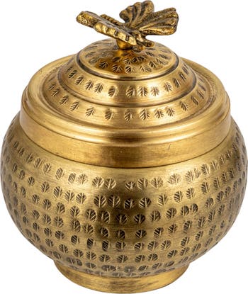 Round Hammered Metal Container with Butterfly Finial, Brass Finish