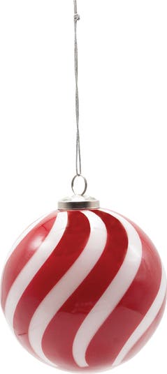 - A charming round hand-blown glass ball ornament featuring delightful swirled stripes in red and white