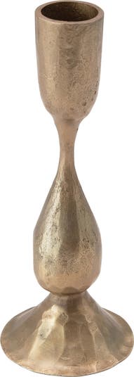 - A sleek and sturdy taper holder that features a hand-forged metal design and an antique brass finish