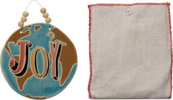 Round Handmade Stoneware Ornament with Wax Relief "Joy" in Linen Bag, Multicolor