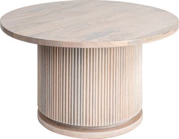 This Mango Wood Coffee Table with Ribbed Base adds a simple and elegant touch to any home. It features a smooth and natural tabletop made of mango wood, durable material with natural variations in color and texture. The table also features a sturdy and stylish ribbed base that supports and stabilizes the tabletop and contrasts with the natural bleached tones. The table measures 30 inches diameter and 17 inches in height. It blends in with any color scheme or theme and suits Scandinavian, modern, or minimalist décor styles. The table has a weight capacity of 100 pounds and requires assembly. This Mango Wood Pedestal CoffeeTable with Ribbed Base adds a simple and elegant touch to any living room.