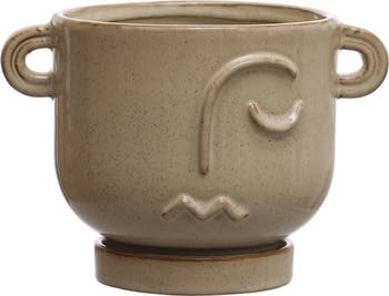 This round reactive glaze Stoneware Face Planter and Planter Saucer Set is a delightful addition to any indoor or outdoor space. Featuring a speckled cream color and a unique reactive glaze finish, each piece varies slightly, adding to its charm. The planter includes handles for easy movement and holds a 5-inch pot. Made of durable stoneware, this set measures 8.25 inches in length, 6.25 inches in width, and 5.75 inches in height, making it both functional and decorative. Perfect for Boho, Scandinavian, French Country, Farmhouse, and Abstract styles. This set is a versatile and stylish choice for plant lovers looking to add a touch of personality to their home decor.