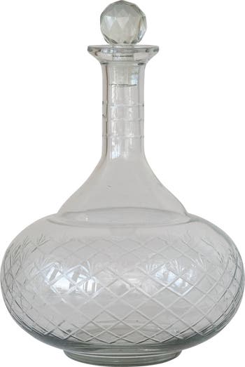 This reclaimed etched glass decanter is a elegant and versatile serveware piece that can elevate any dining or living space. The decanter features a delicate floral etching that adds a touch of charm and sophistication. The round stopper fits snugly on the top of the decanter, preventing any spills or dust. The clear glass material is made of reclaimed glass that is unique, as each decanter is handcrafted by skilled artisans. The decanter can be used as a decanter to serve wine, water, or liquor, enhancing the flavor and aroma of the beverages. The decanter can also be used as a vase to display fresh or dried flowers, adding some color and freshness to any room. The decanter measures 8.25 inches in diameter and 12 inches in height, with a capacity of 17 ounces. It is a perfect choice for anyone who loves farmhouse, cottagecore, French country, or coastal style.
