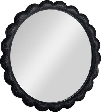 This round, distressed wood scalloped wall mirror is a charming and elegant addition to any space. It features an antique black solid wood frame with scalloped edge. The perfect transitional piece, use in any space from boho to modern farmhouse. The wall mirror measures 27.75 inches in diameter and will make a statement in your bathroom, bedroom, hallway, or entry.
