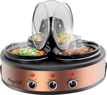 With the New MegaChef Triple 1.5 Quart Slow Cooker and Buffet Server in Brushed Copper and Black Finish with 3 Ceramic Cooking Pots and Removable Lid Rests will be your helping hand whenever you need to prepare multiple meals simultaneously without the hustle and bustle of a restaurant kitchen! With this incredible kitchen tool, you will be able to not only cook 3 individual meals at the same time without having to monitor the stove, but you will also be able to keep those meals hot and serve them to your family and friends or guests and coworkers without breaking a sweat. This stunning slow cooker and buffer server features 3 Ceramic 1.5 Quart Cooking Pots with their own settings allowing you to control the heat level for each meal you cook. With the included detachable lid rests, your guests can easily serve themselves hassle free. Once you try serving meals with such ease it may be difficult to go without this unit again at any gathering!CUT YOUR COOKING TIME IN 3: Each of the 1.5 quart Ceramic Slow Cooker Pots is equipped with individual controls for your convenience. Allowing you to cook 3 individual dishes simultaneously! 3 SETTINGS PER EACH POT: Each Ceramic Slow Cooker Pots offers a LOW, HIGH and WARM Setting. Allowing you to not only cook 3 individual meals but keep them warm to be served to your family or guests!REMOVABLE LID RESTS: A convenient detachable lid rest is included for each of the Ceramic Slow Cooker Pots! Once you are ready to serve simply place the lids into their rests to allow easy access to the delicious meals you've prepared!ANTI SLIP FEET: This unit features anti slip rubber feet to ensure your Buffet Server Slow Cooker stays safely secure while you serve.Includes Three 1.5 Quart Ceramic Cooking Pots!