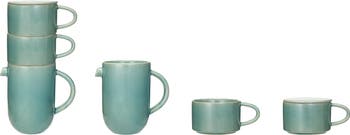 This aqua stoneware pitcher with stackable mugs and lid is a charming addition to any serveware collection. Its charming design features a lovely aqua color and a reactive crackle glaze finish, making each piece unique. Made of durable stoneware, it can withstand high temperatures and frequent use. The set is also convenient and can be used for serving and enjoying hot or cold beverages, such as coffee, tea, milk, or juice. The set includes a pitcher with a curved handle and spout for easy pouring and a lid that keeps contents fresh and warm. The set also includes two round mugs with a handle for comfortable holding and stackable storage. This set can fit any style, from farmhouse to lodge to cabin, coastal to modern, and adds a cozy touch to the table. The pitcher measures 6 inches in length, 4 inches in width, and 10.75 inches in height, holding 30 ounces of liquid. Use it for everyday dining or special occasions, this aqua stoneware pitcher with stackable mugs and lid will impress the guests and enhance the beverage presentation.