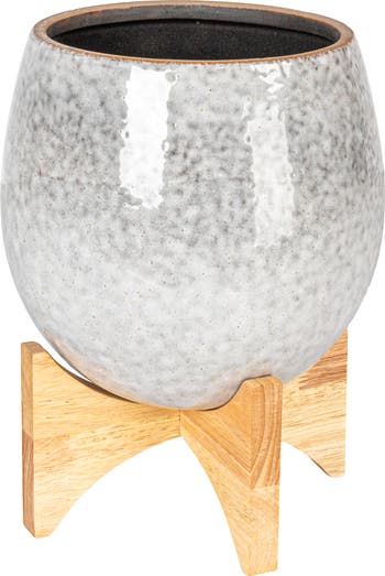 Round Stoneware Planter on a Wood Stand with Reactive Glaze, Grey and Natural