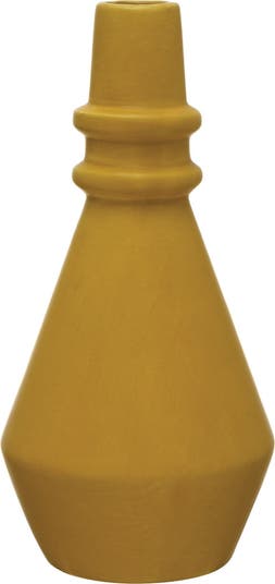 Add some color and elegance to the home with this mustard stoneware taper holder. This taper holder is a stylish and sturdy accessory that can hold a standard taper candle. The taper holder features a round base and a mustard color that will brighten up any space. The taper holder is made of durable stoneware that is durable and easy to clean. Place the taper holder on a mantelpiece, dining table, console table, or any other surface that needs some warmth and charm. The taper holder will create a cozy and inviting atmosphere with its soft glow. The taper holder measures 3.75 inches in diameter and 8 inches in height, making it a great size for any room. This mustard stoneware taper holder is a perfect way to add some style and functionality to the home.