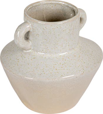 This light grey stoneware vase jar with handles adds style and functionality to any home. The stoneware vase jar has a classic shape with a wide mouth and a tapered base. It also has two vertical handles that make it easy to move and carry. The vase jar has a light grey color with a reactive glaze finish that creates variations in tone and texture. The glaze also gives the vase jar a glossy and smooth surface. The vase jar is made of stoneware, which is durable and easy to clean. It can hold water and live plants or be used as a decorative accent on its own. It can be used as a centerpiece, a storage container, or a flower vase. The vase jar measures 8.5 inches long, 7 inches wide, and 8.25 inches high. This decorative vase is a simple yet elegant addition to any home décor.