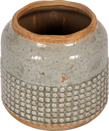 - A lovely round planter/vase with a hobnail texture and heavily distressed glazed finish; glaze color varies from light blue to grey to sage green