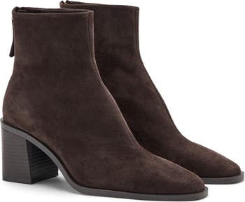 A split seam highlights the rounded toe on a streamlined suede bootie lofted by a chunky, stacked heel and secured with an easy rear zipper.