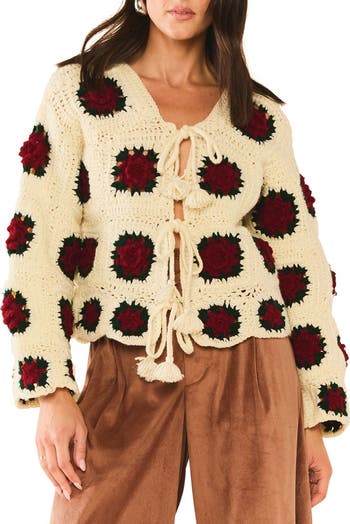 A love letter to a vintage find. Inspired by a piece we sourced and reimagined in soft wool, this tie-front crochet cardigan brings old-world charm to now. Rosette “granny” squares bloom across an ivory ground. A v-neckline and easy sleeves, finished with tassel ties that fasten at the front.