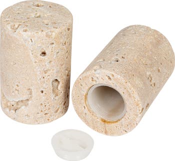 - A pair of elegant salt and pepper shakers with a travertine material and a natural color that adds a touch of sophistication and style to any table setting
