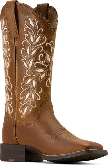 Vine-inspired embroidery traces the leather shaft of this stacked block-heel Western boot bringing romantic detail to a classic cowboy silhouette.