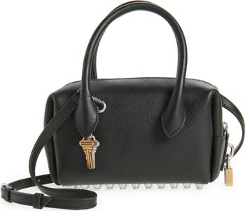 Signature stud hardware creates mesmerizing rows along the bottom of a structured top-handle bag crafted of small-grain leather in a slim, rectangular shape accented by branded key charms and padlock clip.