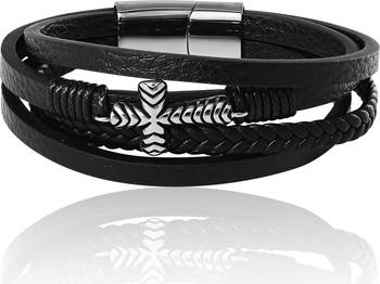 This layered bracelet features woven and smooth black leather bands accented by a bold silver-tone cross charm, blending modern style with symbolic flair.
