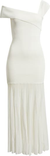 A close-fitting knit maxi is topped with a folded shoulder-showing neckline and finished with a contrasting swingy skirt.
