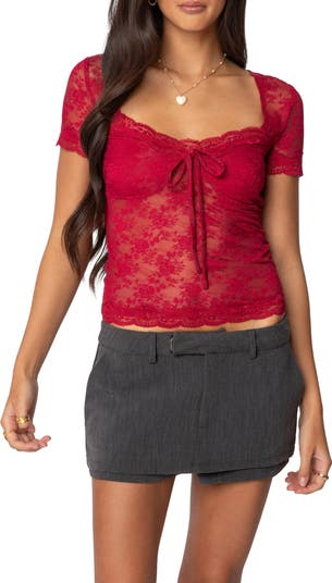This full-of-charm top is fashioned from lovely lace that's sheer below the bust and topped with a sweetheart neckline.