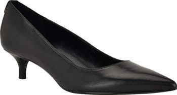A pointy toe furthers the streamlined profile of a smooth leather pump set on a tapered kitten heel for a whisper of height.