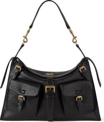 This slouchy iteration of the Roxanne bag is crafted from shiny leather and kept organized with exterior pockets secured with smartly buckled straps.