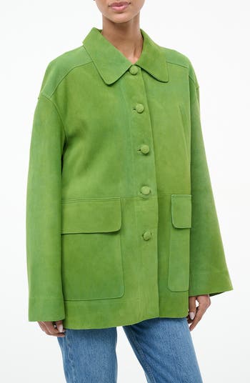A verdant hue adds springy verve to a genuine suede jacket closed with covered buttons.