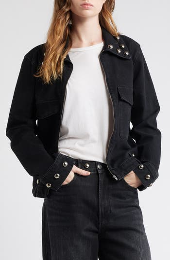 An inky black denim jacket turns up the rockstar status with the addition of silvery studs on the collar and cuffs.