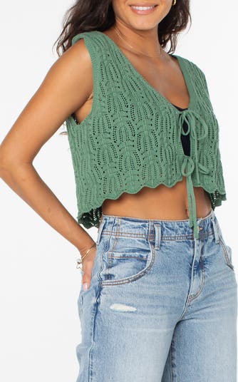 A duo of dainty ties fastens the front of this cutely cropped, crochet-inspired vest that looks perfect layered over your beach attire.