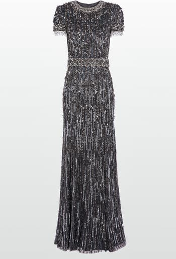 This stunning gown is intricately decorated with beads and sequins, creating a richly textured and luxurious appearance. It features a fitted bodice with a high neckline and short sleeves, emphasizing elegance and sophistication. The waist is accentuated with a beaded band, and the skirt flows gracefully to the floor, enhancing its regal and glamorous style. Perfect for high-profile events, such as gala dinners or red carpet occasions, this dress exudes luxury and statement-making style.