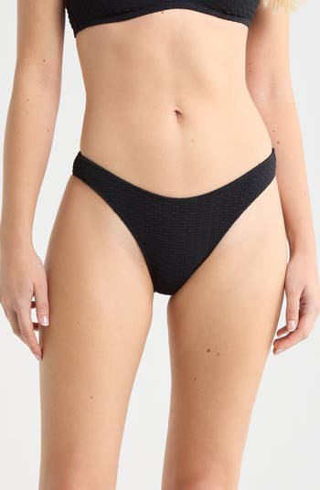 These softly textured bikini bottoms are cut in a classic hipster silhouette with a scooped out front that subtly modernizes the look.