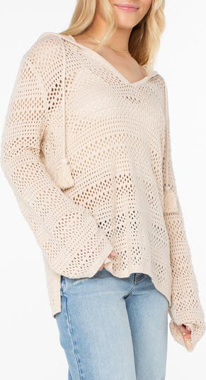 Lovely open stitching blankets a sun-ready hoodie that has swishy tassels on the drawstrings for free-spirited style.