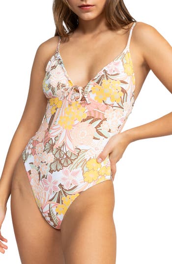 A low back lends sunny energy to this floral one-piece with slender straps and cheeky coverage.