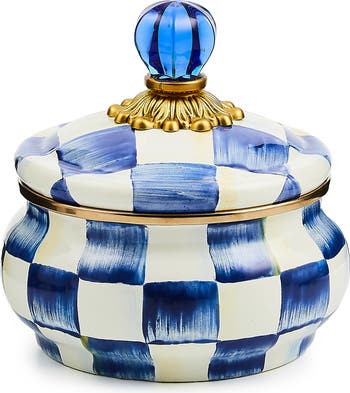 Hand-painted color-dragged checks further the retro vibes of this enameled-steel pot that's a head-turning accent whether or not you've got any treasures stashed in it.